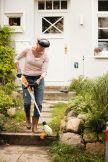 Compacta desbrozadora de batería para limpieza alrededor de la casa. Batería integrada, con indicador de carga, manillar ajustable sin herramientas y ángulo de corte para trabajos verticales.