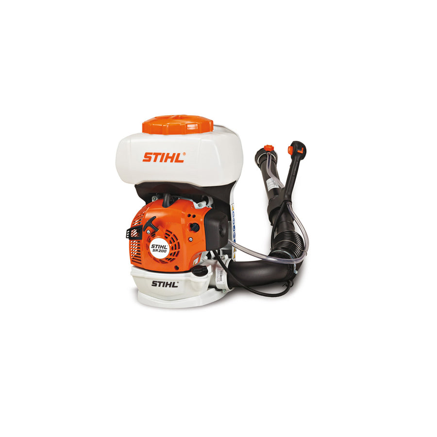 El motor de gasolina acciona la rueda del ventilador, de modo que el flujo de aire generado agita las hojas de los arbustos y de los árboles más pequeños y las rocía uniformemente hasta una altura de 2,5 m. Las rejillas cónicas, de deflexión y de doble deflexión suministradas de serie permiten regular la forma y dirección del chorro de pulverización.